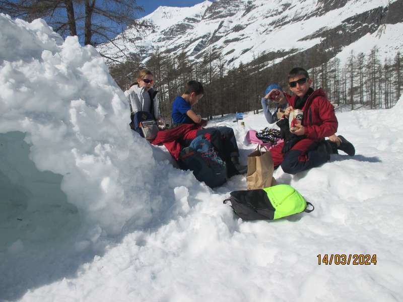 Il était 7 heures du matin lorsque nous nous sommes réveillés. À notre séance de ski du matin, nous sommes allés au stade de biathlon, on a vu la cascade de glace et nous sommes allés voir une technique de conservation de la neige en été, elle s’appelle le « snowfarming ». C’est un gros tas de neige fabriqué à l’aide de canons à neige pendant tout l’hiver. À la fin de l’hiver, il faut mettre des copeaux de bois dessus. L’après midi nous avons fait une balade en raquettes. À la pause nous avons fait des igloos. Après le gouter nous sommes allés à Bessans faire les boutiques. On a fait deux magasins, un était mieux que l’autre. Il y en a qui ont pris des doudous, d’autres ont pris des porte-clés ect ….
