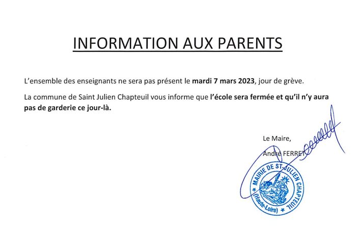 A la suite de l’appel des organisations syndicales, les enseignants Mr Perbet, Mes Dursapt, Gay, Kania, Chaupitre et Barriol DĂ©cot seront en grève le mardi 7 mars.