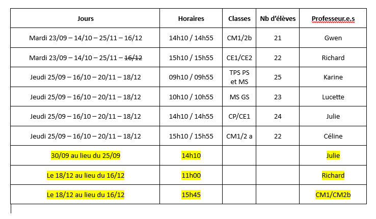 1er semestre, chaque lundi de 14h00 à 15h15-Classe chorale élèves de CM1 (en attente de confirmation)