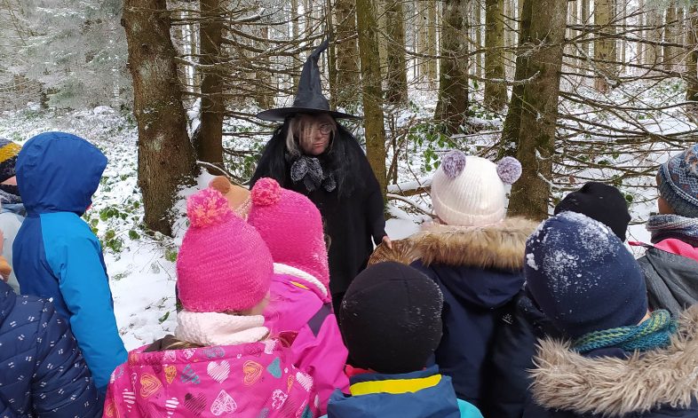 Très attentifs, les enfants ont écouté le récit et ont passé un moment agréable et interactif avec cette curieuse sorcière. Puis, ils ont repris le chemin du chalet où ils ont goûté au plaisir de jouer et de créer avec la neige avant de regagner leur école, déjà impatients de vivre une troisième journée de classe dehors.