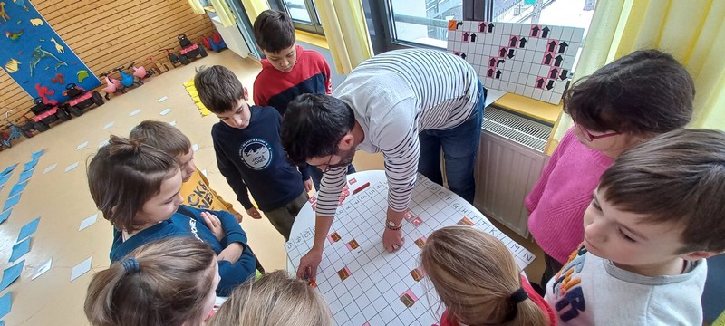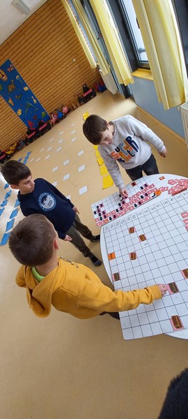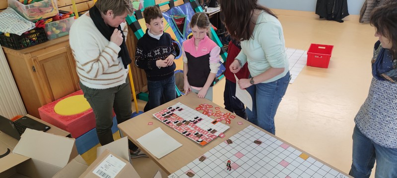 Un autre atelier avec le jeu du pirate se centrait sur le codage d’un déplacement. Par groupe, les élèves devaient retrouver le programme qui permettait au pirate d’arriver au trésor.