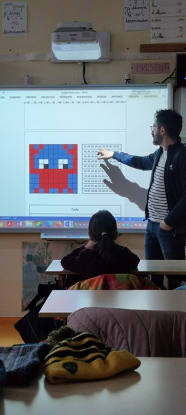 Le dernier groupe de travail consistait à identifier le codage binaire employé sur le Pixel Art avec le décodage et l’encodage. Les premières bases de la programmation posées, les élèves élaboraient les programmes avec uniquement le 0 et le 1 !