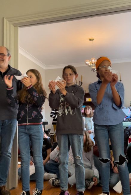 Après un accueil bien chaleureux, les élèves ont fait leur spectacle pour le plus grand bonheur des spectateurs enthousiastes. Au programme, des poésies d’auteurs classiques français, des chansons d’Evelyne Gallet placée dans la tradition de la chanson à texte, des histoires illustrées par des origamis.