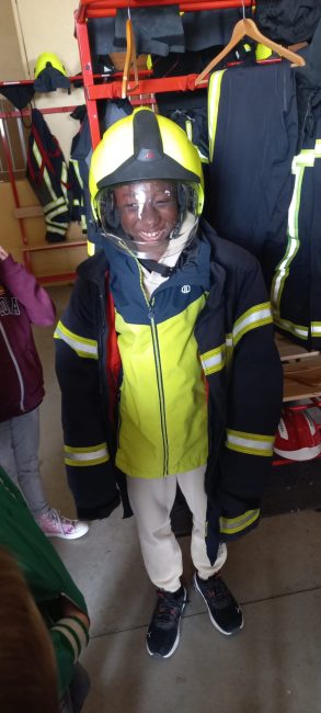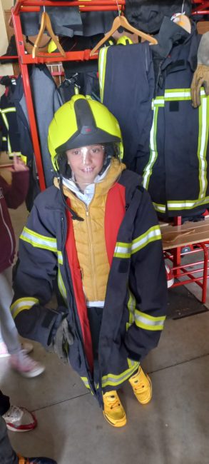 Ils ont aussi pu essayer casque et veste et se sont aperçus que l’équipement d’un pompier était très lourd : près de 15 kg au total !