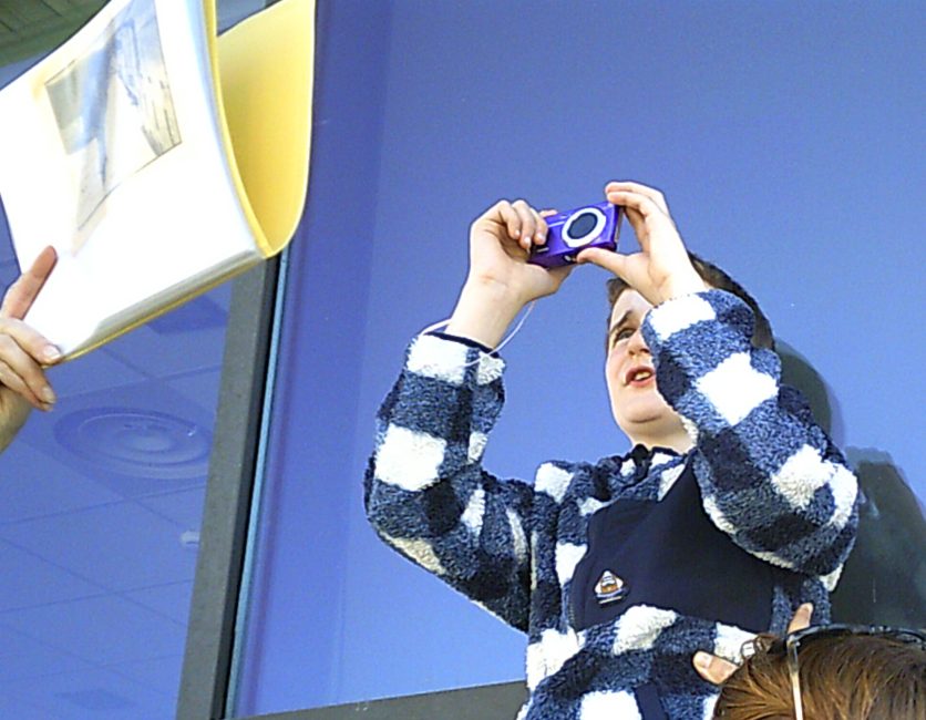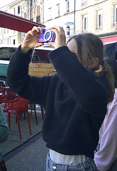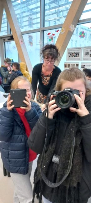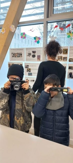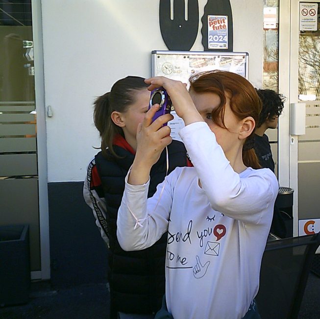Puis, les deux classes se sont initiées à la technique photographique grâce à Virginie Giraud, photographe professionnelle. Par groupe, ils ont photographié des bâtiments emblématiques de la ville. Ils ont pu mettre « en miroir » photographies d’aujourd’hui et cartes postales d’autrefois.
