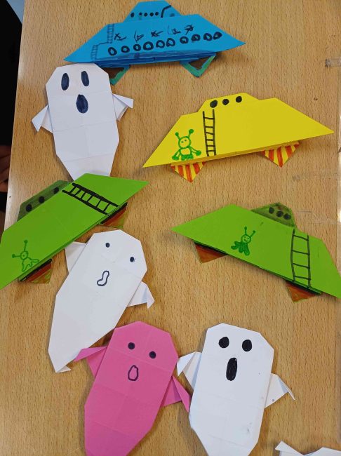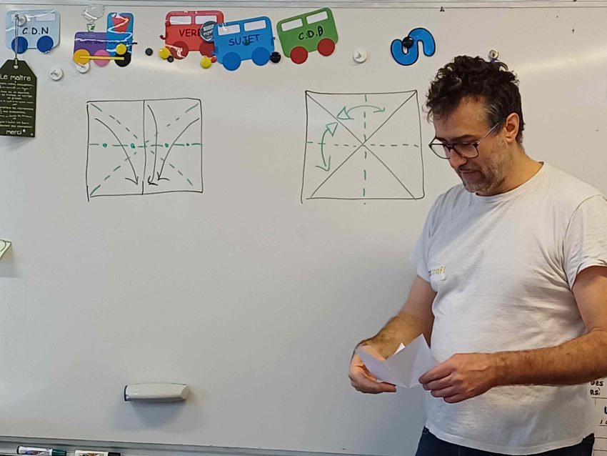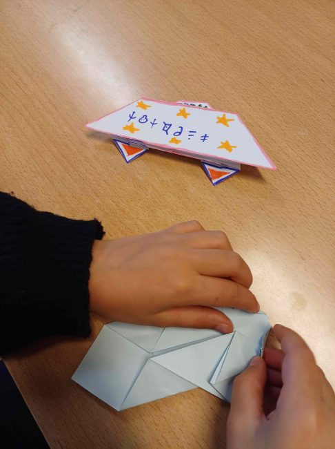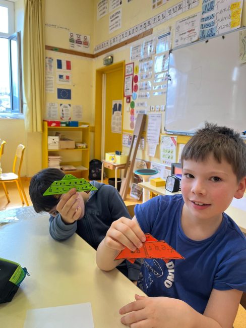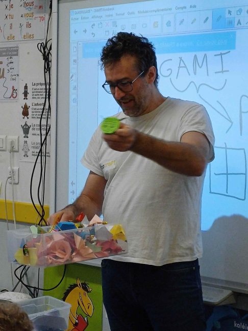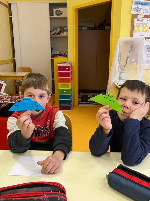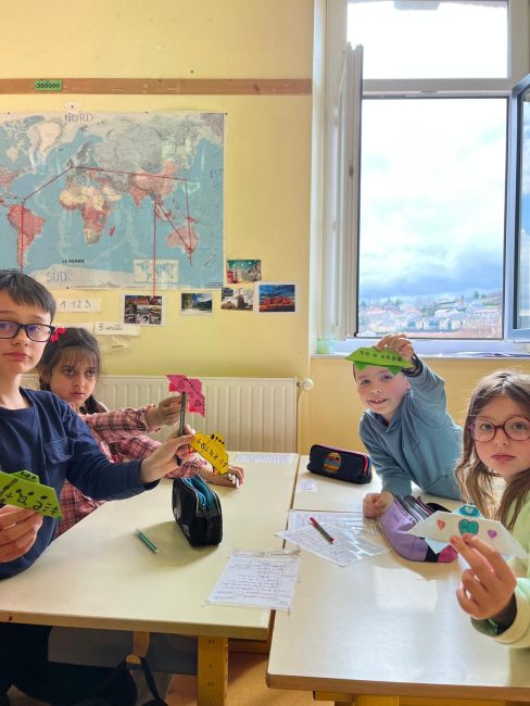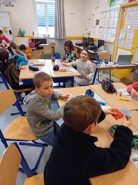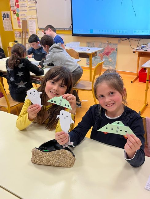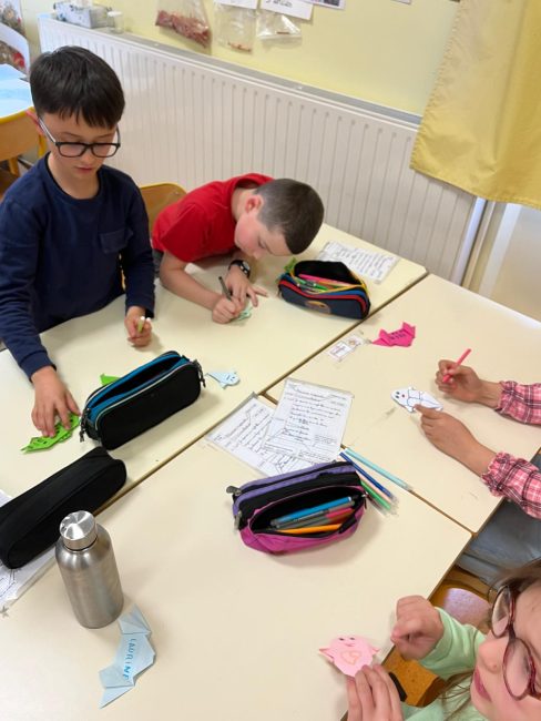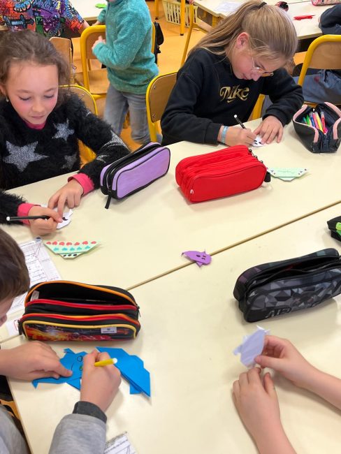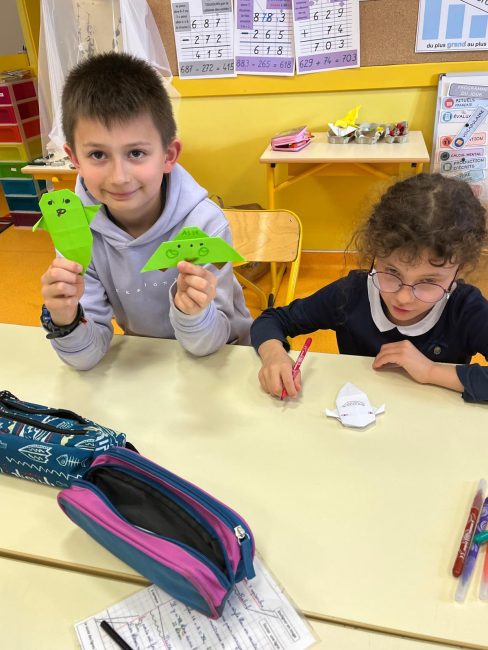 Ensuite, il a montré aux enfants quelques modèles simples, comme la toupie ou des animaux . Les CE2, désireux de créer un objet ont eu l’opportunité de manipuler le papier et de suivre des instructions étape par étape pour créer leurs propres œuvres. Il a fallu de la patience et de la ténacité. Mais quelle satisfaction de voir que leurs efforts n’étaient pas vains…