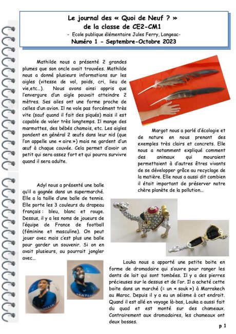 Vous trouverez ci-dessous quelques notes et photos prises lors des « Quoi de Neuf ?  » de la classe de CE2-CM1. Il s’agit de courtes présentations de 5 minutes (questions comprises) durant lesquelles on peut présenter un « objet » (naturel ou fabriqué par l’Homme), un sujet, une expérience personnelle … qui nous parait intéressant(e) pour le reste de la classe. Ainsi, une semaine sur 2, c’est l’occasion de prendre la parole devant tout un groupe (très attentif !) et d’apprendre des choses sur des sujets très variés. Un président du « Quoi de neuf » et un « maitre du temps » gèrent ces temps de présentation.