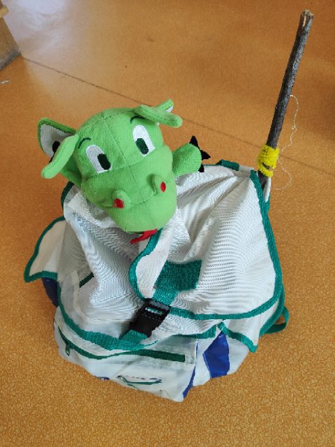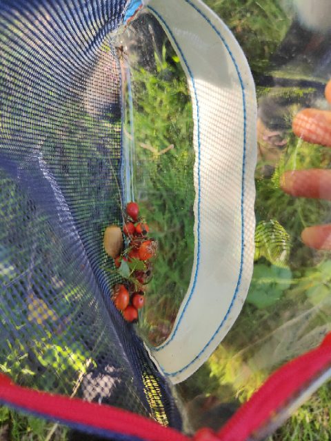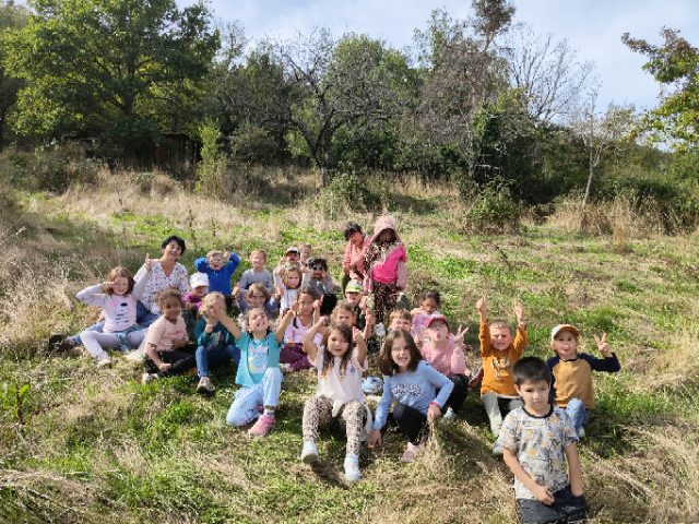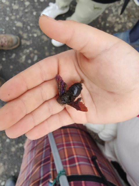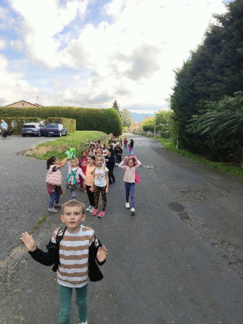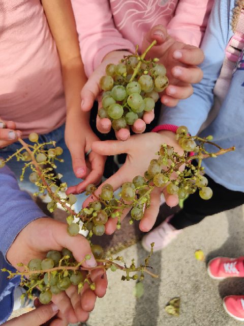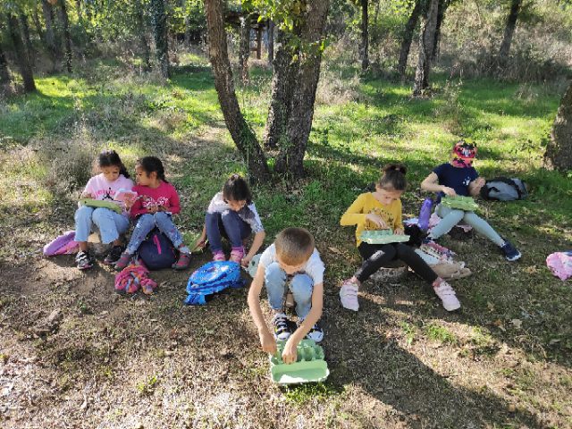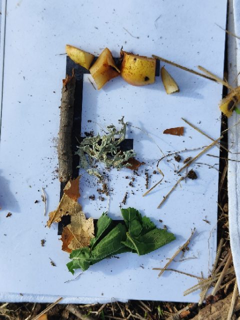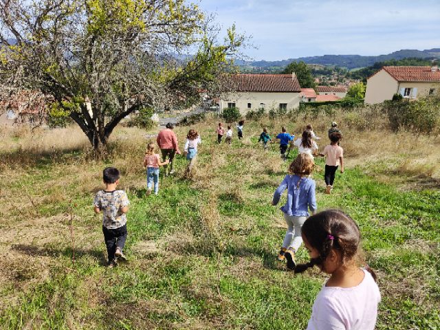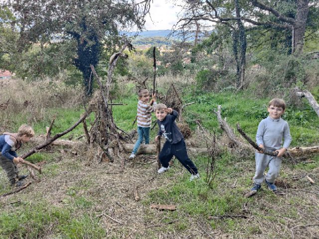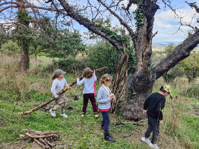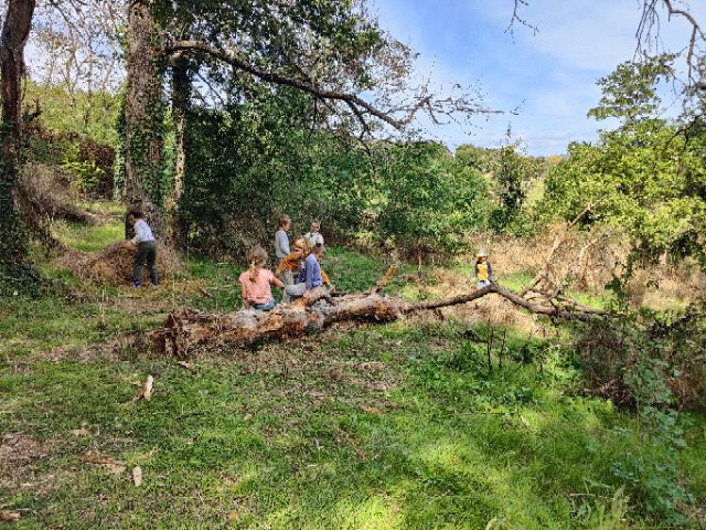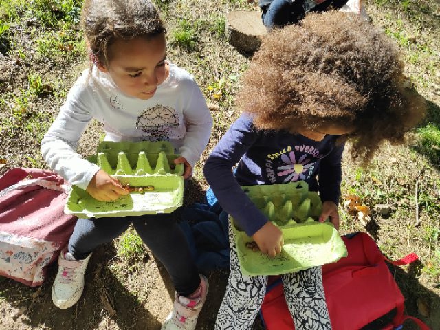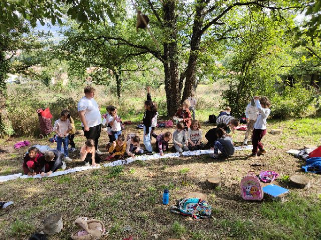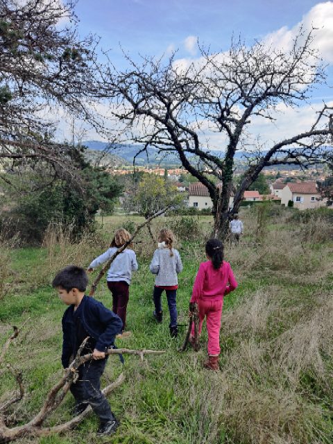 On a fait une grande récréation : on pouvait ramasser des feuilles, faire des petites cabanes, faire des câlins aux arbres, chercher des traces d’animaux, observer des insectes et des arbres fruitiers. Quelques enfants avaient apporté du matériel dans le petit sac à dos et nous l’ont montré : des boîtes d’observation, de la ficelle, des pochettes à trous, un miroir, des jumelles… »