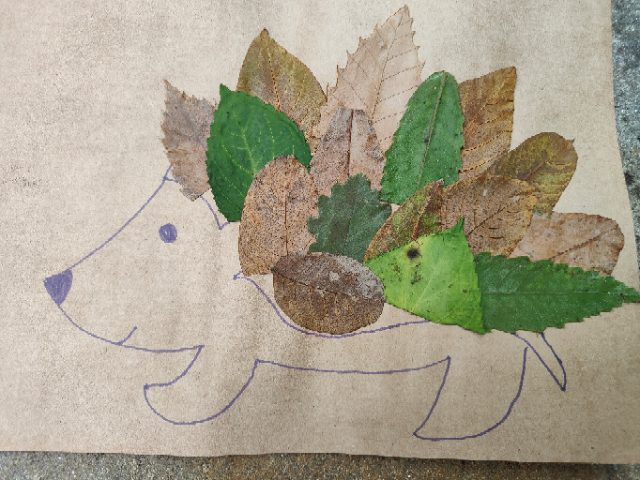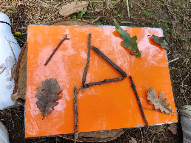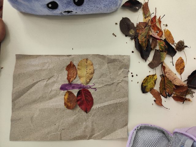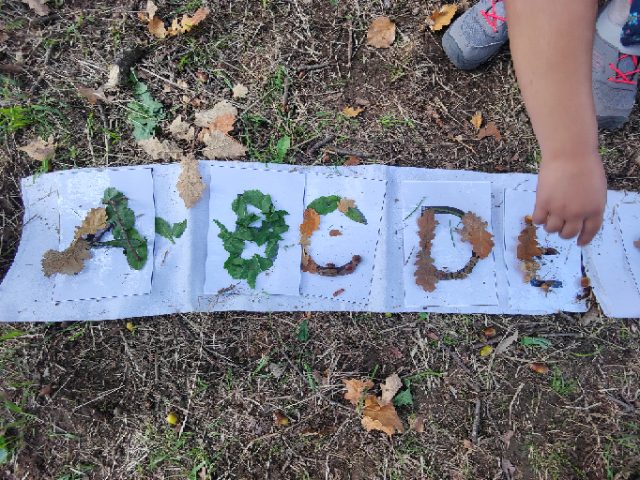 « Pour la deuxième séance, Taoki est venu avec nous! Il nous a aidés à trouver le trajet plus court! Sur le terrain, on a travaillé la lecture et les arts plastiques : on a ramassé des objets naturels (feuilles, glands, bâtons, fleurs, fruits, cailloux…) qu’on a mis sur des lettres en plastique pour fabriquer un abécédaire éphémère : c’était très joli! » « Ensuite, on a fait des dessins par deux avec 10 objets naturels et chaque groupe est allé découvrir les dessins des autres. »