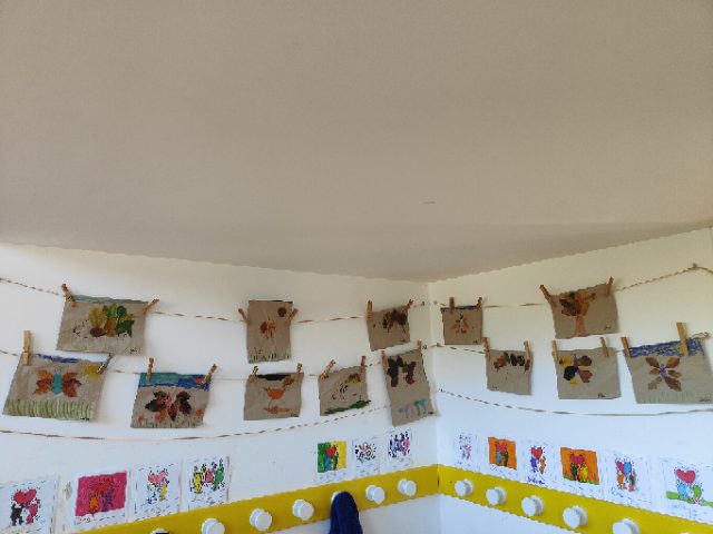 « La fois suivante, on a décoré le coin classe où il y a des souches pour s’assoir. On a créé des suspensions et des guirlandes d’objets naturels qu’on a ensuite accrochées au fil qui délimite le coin classe; ça fait joli! »